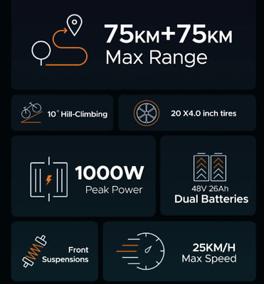 • 26×4″ wide tires for stable off-road riding and comfortable city travel.